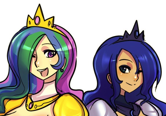 Celestia looked over at her sister sitting beside her, Princess Luna, obviously the person Garth was speaking of. Much like her sister, Luna was wearing a dark blue dress, which also revealed her generous cleavage, with light violet shoulder pads along with a black necklace and crown with blue gems. Compared to her sister her breast size was smaller, but not by any means tiny. Her skin was a light tan, contrasting her sister’s paler skin color. Along with that was her lavish sapphire hair that reached far down her back. Her face was younger looking, and could be described as cute, with her small button nose and dark cyan eyes.