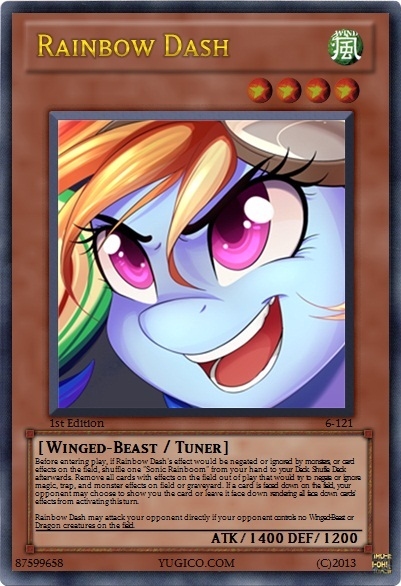 Diamond scuffed at this, she was just about to get to the good part too. Where she cleverly discarded one of her Tuner cards to the graveyard to only have it return to the field so she can combine Rainbow Dash with the other level 4 star pony monster Firefly to create the Legendary Super Rainbow of Justice!