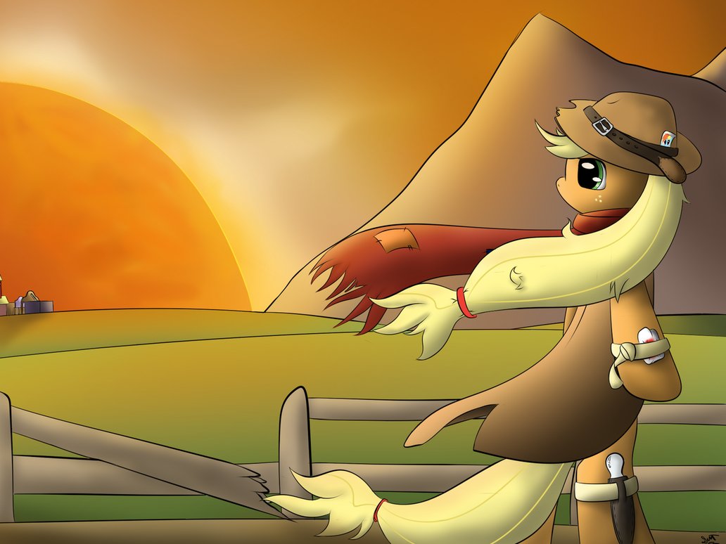 Applejack trotted down the muddy brick street. Dead and waterlogged weeds popped up through the spaces in between the bricks and brushed against Applejack's hooves as she walked. The street was empty aside from the occasional stray animal or shady shopkeeper. Applejack knew the residents of this street quite well. She had come to know a lot about the grimy underbelly of the Manehattan safe zone during the ten years she had spent there.