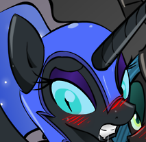 Chrysalis snorted, barely holding back a laugh. “Oh Moony, you can just be so cute sometimes.” Nightmare’s face was entirely made up of red at the use of Chrysalis’s new pet name for her.