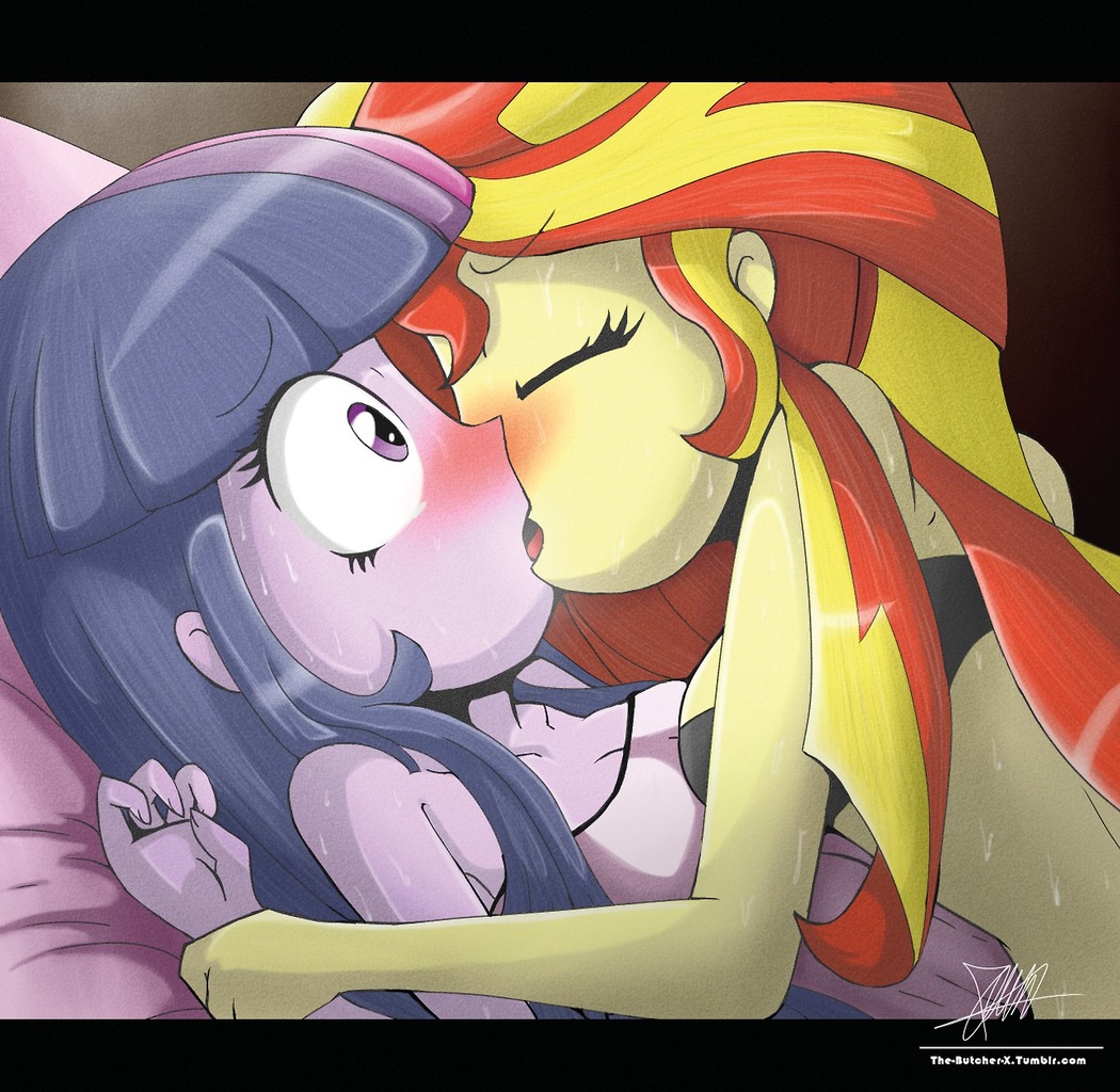 Twilight raised her hands behind her back, reaching up towards her bra so that she could remove it, but her hands were stopped by Sunset Shimmer’s, which had reached around Twilight and beat her to the punch. Silently lowering her hands, Twilight allowed Sunset to remove the bra for her. For some reason, this act alone made Twilight’s heart pound even more, and she could feel the ache between her legs growing yet again.