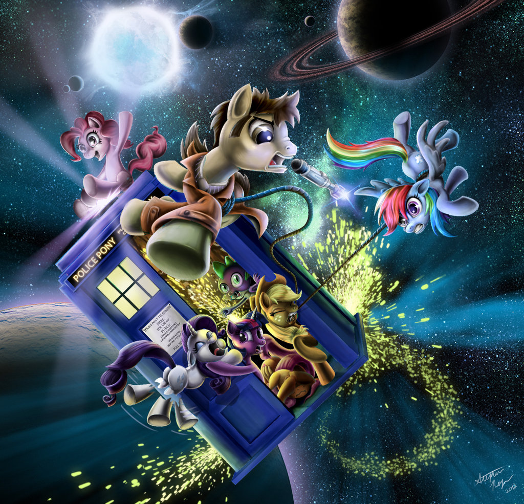 The brown stallion smiled brightly as he stood on his hind legs and held out his hooves. “Ladies and gentledrakes! Welcome to…” He paused for dramatic effect. “The TARDIS!”