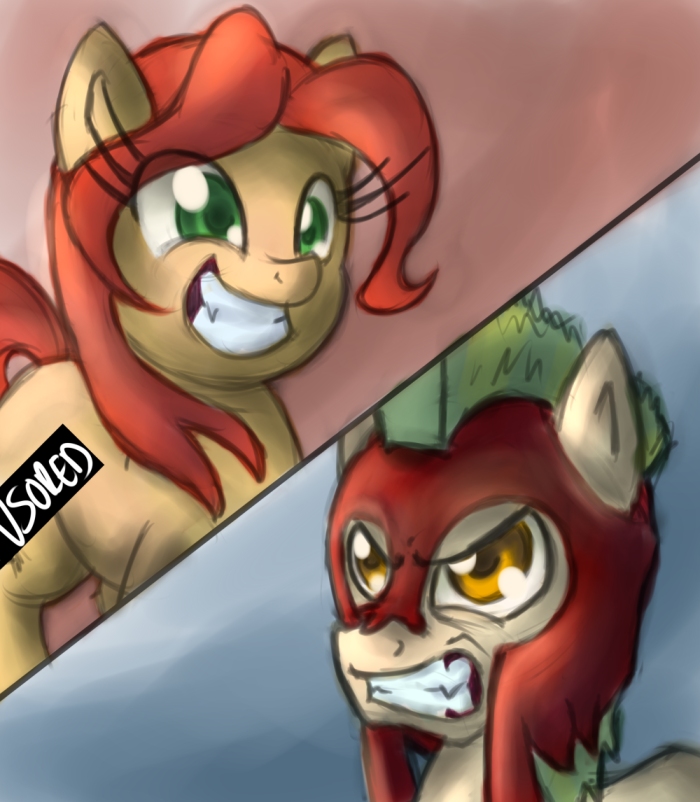 Knighty found Poultron waiting for him on the couch as he exited the kitchen, his brow coated in a faint sweat from the heat and work of the dish washing. He wanted nothing more than to curl up in bed with a nice shipfic and sleep the rest of the evening away – but Poultron was right, he did have a program coming up, and apparently one Poultron wanted to watch with him. Resignedly, he fell onto the couch with an unceremonious thump, causing the faded cushion to fold with his weight. Poultron turned to meet him as he sat. Knighty tried speaking first to avoid the inevitable insanity sure to spill from the earth-pony’s mouth.