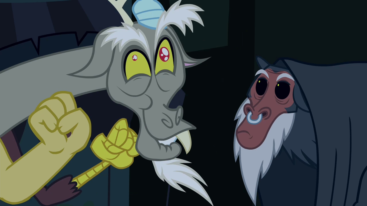 “Well, only if you insist, Tirek-deary.” Discord hopped out of his chair, and with a snap and a spin, he was outfitted with an utterly ridiculous flamboyant vest and that sparkled like a diamond had thrown up on it, and leather pants so tight they may as well have been grafted onto his skin. With another snap, hair like an overgrown bush sprouted on his chest, along with a twirly mustache to complete the look.