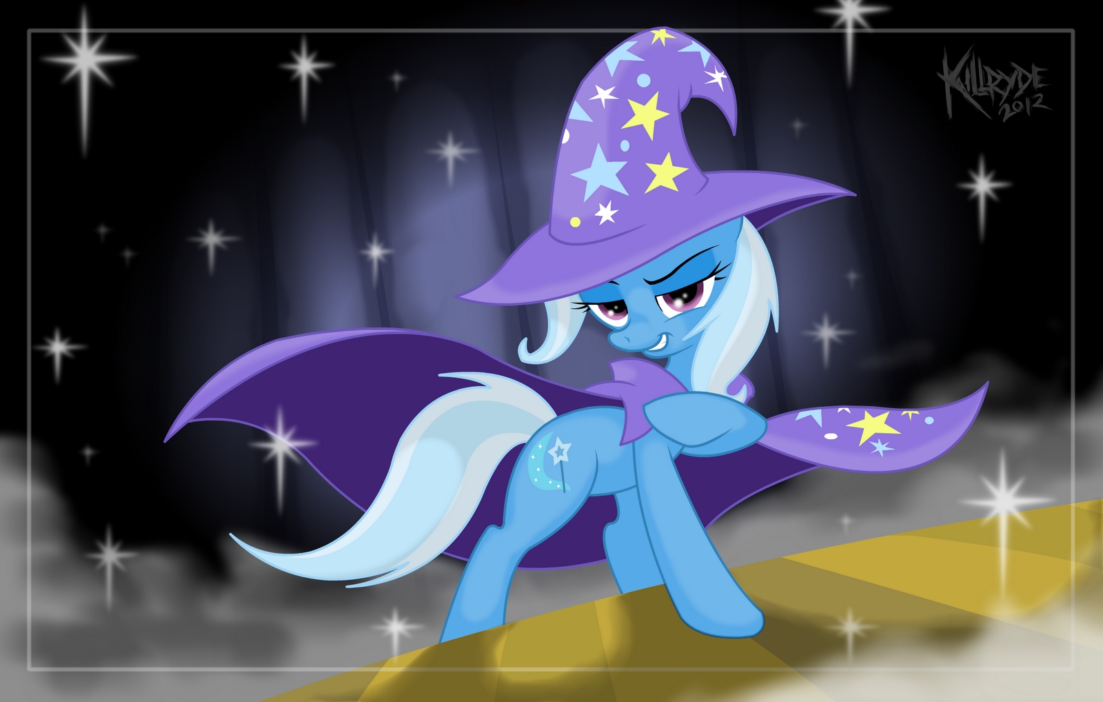 The usual bursts of magical pyrotechnics signaled the end of another successful performance by the Great and Powerful Trixie. There were only two challengers this time, but she supposed Horsetown was a humbler place than some others she'd visited. Really , she reflected while relaxing in her wagon, some ponies have SUCH an ego.