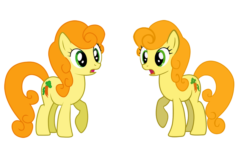 For the first time the other Carrot Top really looked closely at her counterpart, and then back at herself. They had the same green eyes, same thick and well groomed mane, same yellow coat, even the same trio of carrots for a cutie mark. It'd be easy for any casual observer to just assume they were entirely identical. Looking closer though, there were subtle differences. The native Carrot Top was, well… not fat, but still clearly accustomed to a more domestically sedentary lifestyle. The foreign Carrot Top by comparison was no athlete, but had a toned lean musculature earned through long hours of plowing fields and other assorted chores.