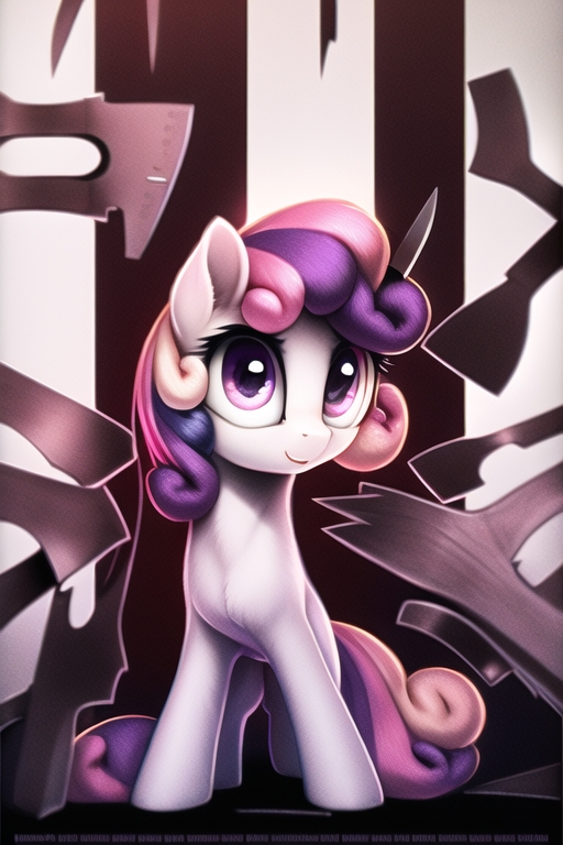 The color ran from her face as she looked down upon the mess that was her younger sister. She was indeed leaning against the bed, splashed and soaked with blood that appeared black in the gloom. Her forelegs were spread out from her tiny body and terminated prematurely, the black liquid spilling into a large pool upon the floor from the shredded meat where her hooves used to be. Sweetie’s eyes were dilated and her throat had been pierced and torn by something intensely sharp and pointed. The gasping was the air circulating in and out through the ragged hole that sputtered and stained the filly’s tiny chest with dozens of splattering drops of blood.