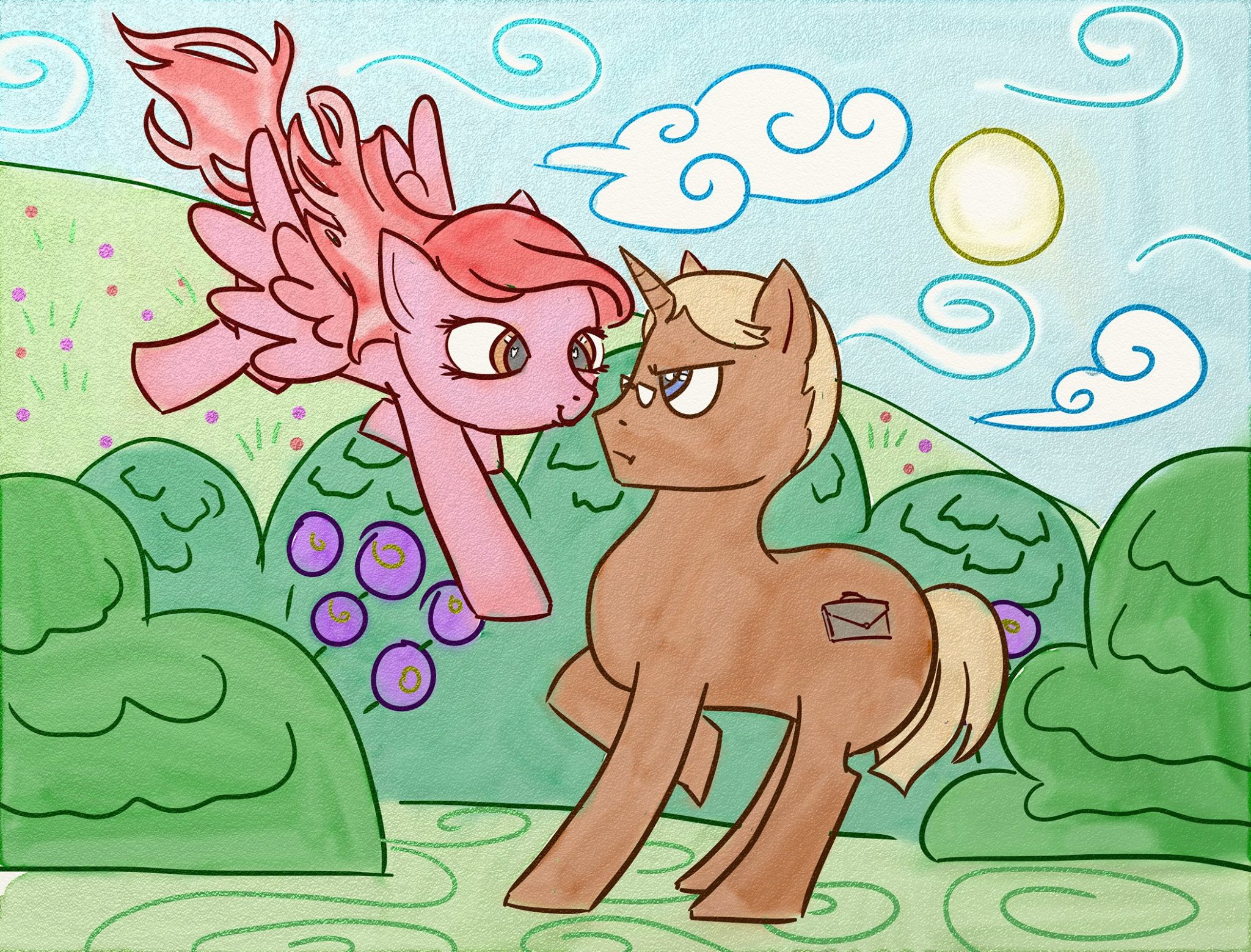 A half hour later, Magnate trotted out the doors and paused when he found her pacing frantically. "I was just hoping to talk to you," he said as he approached her, his tone matter-of-fact. "I found a potential special somepony."