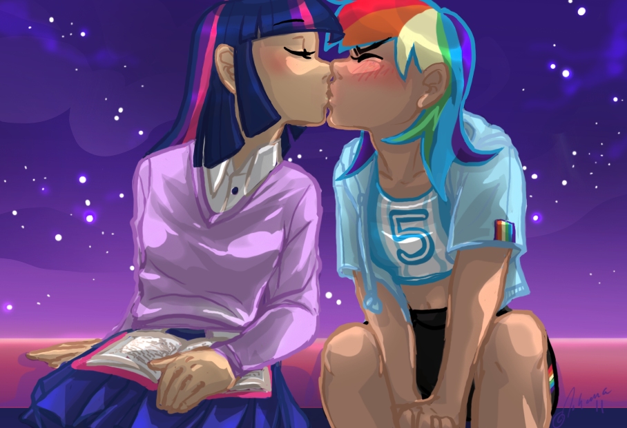 Making matters worse, her world's Twilight was apparently a new student at Canterlot U. Rainbow kept seeing her all over the place. In the quad, in the Student Center, and even in her private sanctum: the sports complex.
