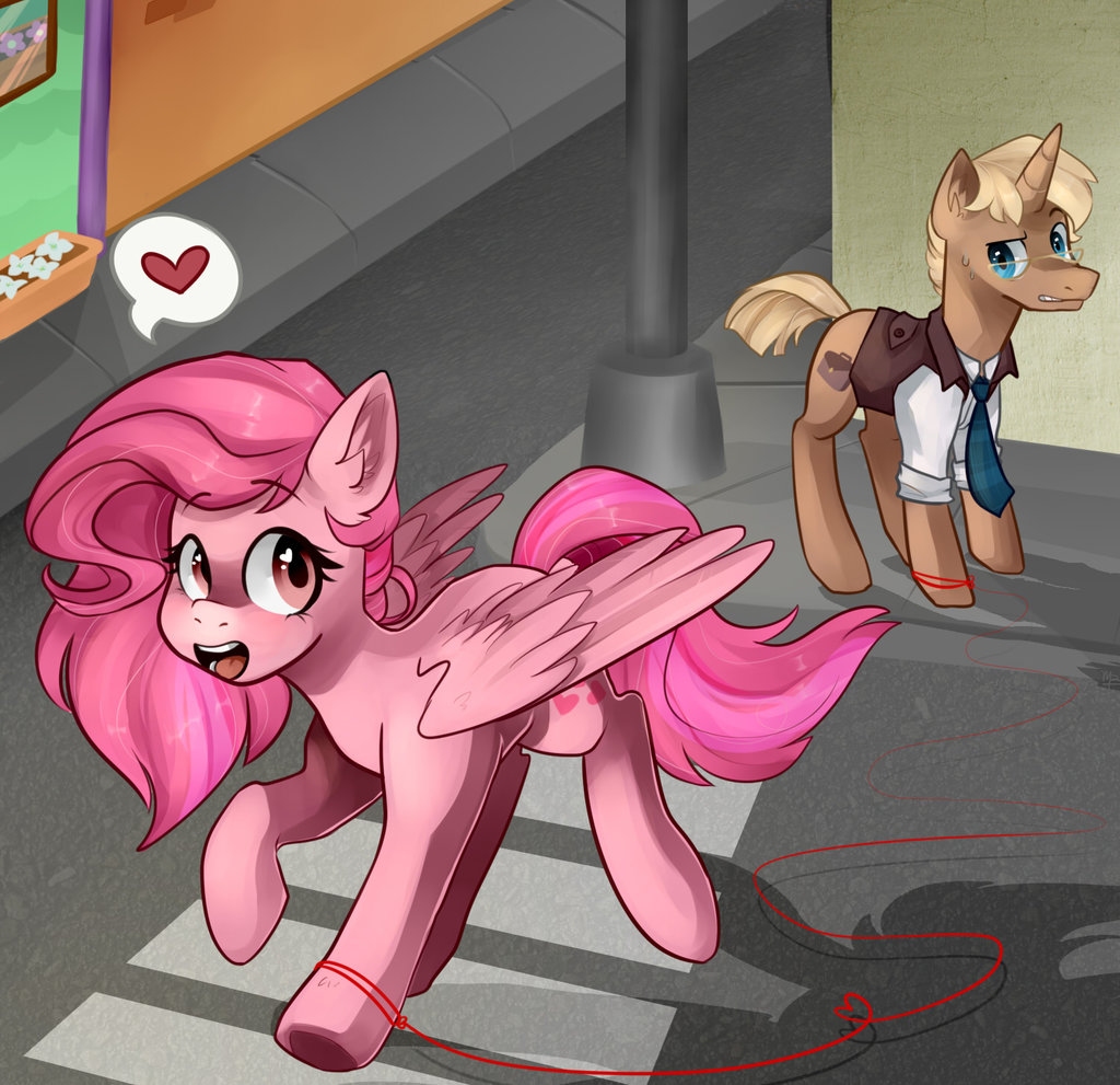Lovey booped him on the nose with her free hoof. "Oh, don't be silly! Love lines don't decide who you'll be with. They decide who you'd be best with, but it's up to you to make the choice! I help ponies find the ends of their love lines so they can live happily ever after."
