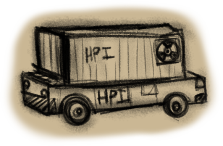 They’re all wearing suits. Like… a hazmat suit had a baby with some riot armor. There’s this blue logo on the back, bunch of circles on it. HPI. Cables from the box go into each one, but I can see the air tanks on the back.