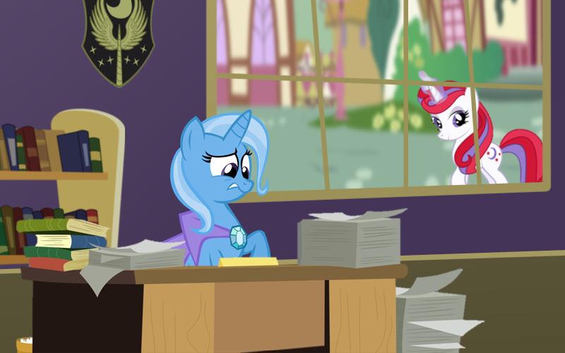 The Element of Magic was pacing in her office while looking at the clock on the wall. It was almost 2 PM, the hour her ad said she would start receiving interviewees for the job of Administrative Assistant to the Representative. She hoped the complicated title would attract somepony serious. This was the first time Trixie would ever hire somepony, and, even though she would never admit it to a living soul, she had no idea what to look for in a candidate. She briefly wondered why the residency hadn't come with a staff and if Princess Luna hadn't just invented more forms for her to file as a type of punishment.