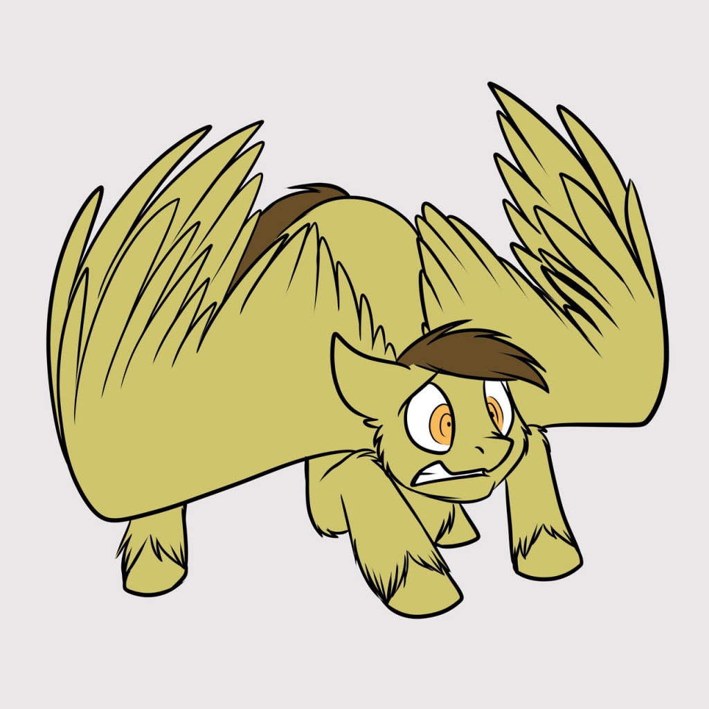 Rivet ended up landing on the floor, on his chest. His arms reached out in all directions. He gathered himself, and got up with a groan. He looked back to see the stallion he had run into was getting, and he didn’t look pleased. He looked like Silver Lining, but he was a lot younger and his mane wasn’t poofy at all. Beside the him was another stallion, he was also grey, but his wind-blown mane was brown with natural yellow highlights on the sides. He was helping the other stallion up. They were both pegasi.