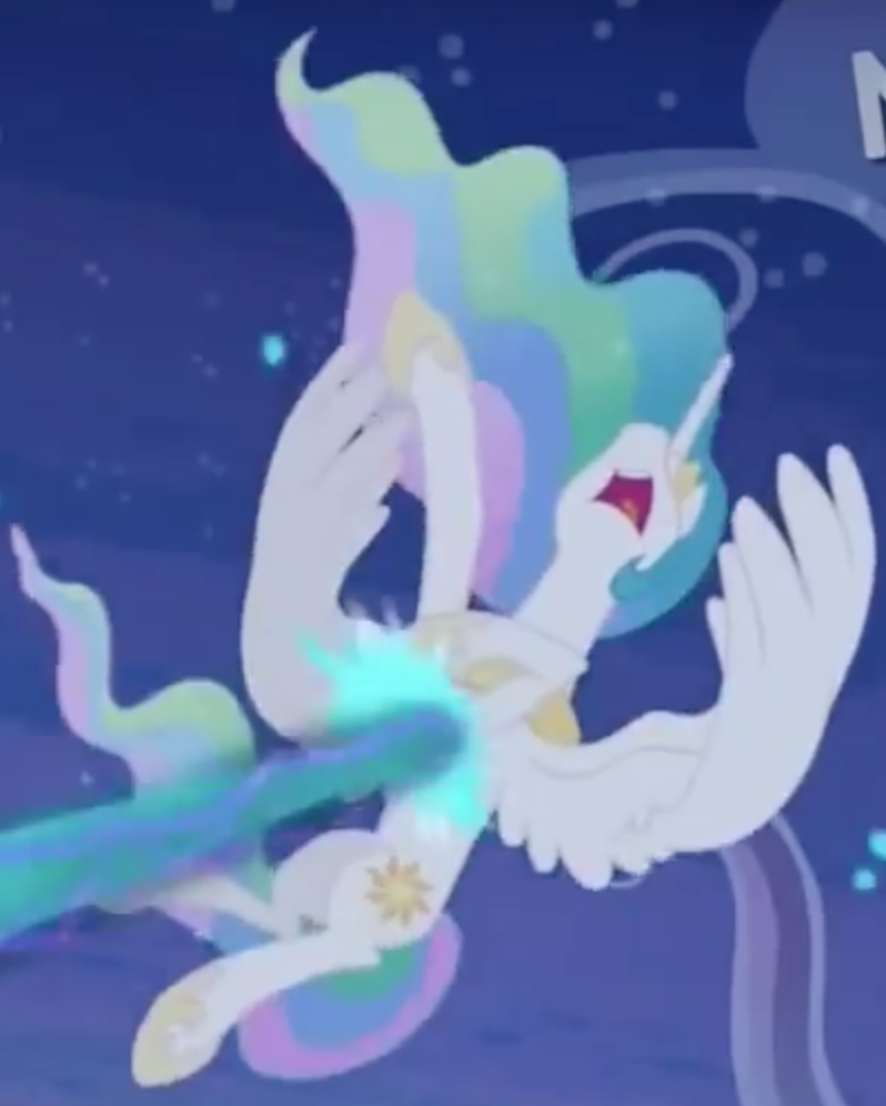 While Celestia was lamenting the apparent impatience of her younger sister, Nightmare Moon took advantage of this opportunity to attack with another burst of magic. Unfortunately, Nightmare Moon, caught up in her desire for vengeance and lust for an eternal night, had failed to realize that Celestia was more than just a princess. She was a skilled magic-user and as such was able to teleport out of the way before it could make contact. This only made Nightmare Moon foam at the mouth in rage as she took to the skies in attempt to oust her sister.