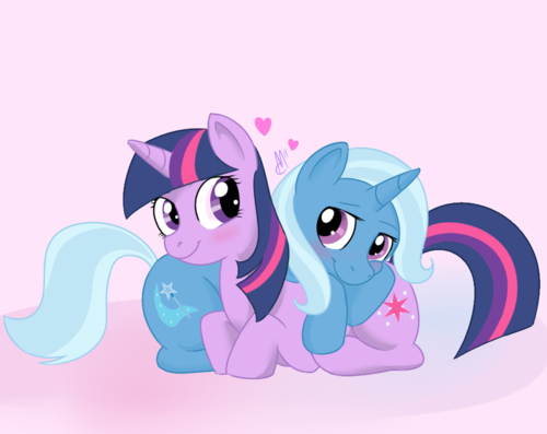 A Twixie Love StoryView OnlineA Twixie Love StoryA Twixie Love StoryTwilight checked her bags once more to make sure that everything was packed. She held up a checklist with her magic and checked off items as she read them aloud. “Ink, check. “Romecolt and Filliet”, check. Food and water, check.” “What is this meet-up, anyway?” Rainbow Dash asked as she pulled off one of the Daring Do books from one of the bookshelves. “It’s some kinda readers meet-up, where ponies get together and discuss books,” Spike explained. “Sounds kind of boring if you ask me.” “Hm…Maybe I should go, too,” Rarity suggested, causing Twilight to flinch and pause her checking. “I do like a good book, and I’ve read my fair share of romance novels. I may be able to raise some good points.” “No!” Twilight shouted, startling the other ponies. She shifted her eyes between each pony, trying to think of a reason for Rarity not to go. “Um…We mostly read, er…Sci-fi! That’s right, sci-fi stuff, so I don’t think you’d be interested!” “Oh, come now, Twilight. I’m nothing if not open to new things.” “Um…They can get pretty violent! And gory!” “You make it sound like I’ve never read a gore story before. Trust me, I’ll be fine. I’ve read Pinkie Pie’s stories, so I should be able to handle anything your group may throw at me.” Twilight paused to think about what kind of stories Pinkie Pie was writing. ‘I think I’ll have to check those out at some point.’ She cleared her head and tried to think of something else. She wracked her brain to think of the one thing Rarity hated more than anything. “Blueblood!” She shouted out, causing Rarity’s eye to twitch. “I beg your pardon?” “Blueblood’s gonna be at the meeting! So, you know…I suppose you could come, but…” “Uh, never mind. I think I’ll just stay here after all.” Twilight sighed as Rarity backed down, and continued packing her bags. “But will you really be alright, staying in Manehatten all by yourself? I mean, won’t you get lonely?” Twilight smiled and started to blush. She was glad that she was faced away from the others, so they couldn’t see her. “I’ll be fine,” she assured Rarity. ‘I’m not really going to be alone, anyway.’ Twilight arrived at Manehatten a few hours later. The town was as noisy as ever, with ponies filling the streets, moving from one place to another, too busy to spare even a word to another pony. Twilight moved through the crowded streets, occasionally getting knocked down by ponies in a hurry, and occasionally having to use her magic to get past a huge crowd of ponies. By her fifth teleport, she was starting to feel dizzy, and wanted to take a break and clear her head. Unfortunately, even if she did stop, the town was far too loud for her to get any peace and quiet. She finally made it through the vast majority of the crowds, and reached the Manehatten public library, where she told her friends that the meeting would be taking place. This, however, wasn’t the truth. It was merely a little lie that she told her friends so that she could be away from them for the weekend without arousing suspicion. Her true destination was a little further down, and so, after taking a deep breath and preparing to make her way through more crowds, Twilight pushed on down the streets of Manehatten. Twilight finally managed to reach her target location: a small park that, at this time of day, was mostly empty. There were one or two ponies cutting through, but for the most part it was completely free of any ponies. In particular, Twilight was heading towards a small wooden caravan that was sitting in the park, near the pond. The caravan wasn’t very big, and along the side of it was a carving of a wisp of smoke and a star-shaped wand. On the front of the caravan was a sign hanging on the door reading: “The G&PT is sleeping! Do not disturb!” Twilight ignored the sign, raised her hoof, and knocked on the front door of the caravan. She received no response, so she knocked again. This time, she heard a groan and the sound of somepony crashing to the floor from inside the caravan. “Go away,” said a voice from inside the caravan. Twilight groaned and knocked again, this time putting emphasis into each knock. Finally, the caravan doors opened. “WHAT do you WANT!?” asked the pony who emerged. It was a Unicorn with a blue coat and purple eyes. Her mane and tail were a beautiful silver colour. Twilight couldn’t help but let out a small laugh at Trixie’s bed mane, which looked like she had just been on the receiving end of a magical misfire. “Oh, Twilight!” Trixie shouted in surprise. She looked down at the purple Unicorn who was laughing at her, wondering what was so funny. She realised that Twilight was laughing at her mane, and quickly ran back inside with a blush on her face. She grabbed her pointy purple hat which had a starry pattern on it. Trixie placed the hat on her head and made her way back to the entrance of her caravan, her mane now hidden from view. “You’re here earlier than Trixie expected,” Trixie said, and then let out a quick yawn. “You interrupted her sleep.” “Sorry,” Twilight said, letting herself into Trixie’s caravan. She wrapped her front legs around Trixie’s neck, and her hug was returned by the blue Unicorn. “I just got so excited that I took an earlier train.” “Honestly, you’re like a filly excited about going on a field trip.” Trixie let out a snicker as she imagined a filly version of Twilight bouncing around in a circle, chanting “yes!” over and over again. “Trixie thinks she’d like to see that.” Twilight pulled away from Trixie and lifted her hat up, much to Trixie’s dismay. She levitated a brush from Trixie’s dresser and brought it over to Trixie’s mane. “Here, let me take care of this,” she offered. Trixie just nodded and turned around, letting Twilight brush her mane
