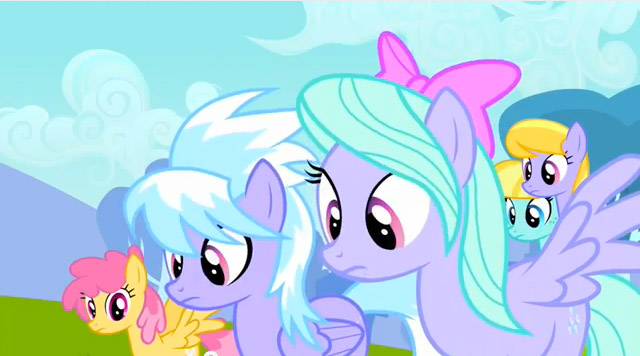 None of this helped Fluttershy -- if anything, all the fillies simply switched to teasing her instead -- but it was one thing for Cloudchaser to see a stranger get the occasional prod. It was quite another to see her sister get the same punishment.
