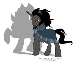 Meanwhile, deep in the Everfree Forest, a tall, dark and sinister figure roams around the forest. A being who's entire body is black like the darkest parts of the entire forest. It's body, or in this case, "her" body is tall and slender and has holes near the bottom of her hooves just like her mane and tail. Her mane and tail matched each other in terms of a dark tael color. Her eyes are both green and tael colored and has pitched black slit pupils that can intimidate even the most vicious of predators in the forest.