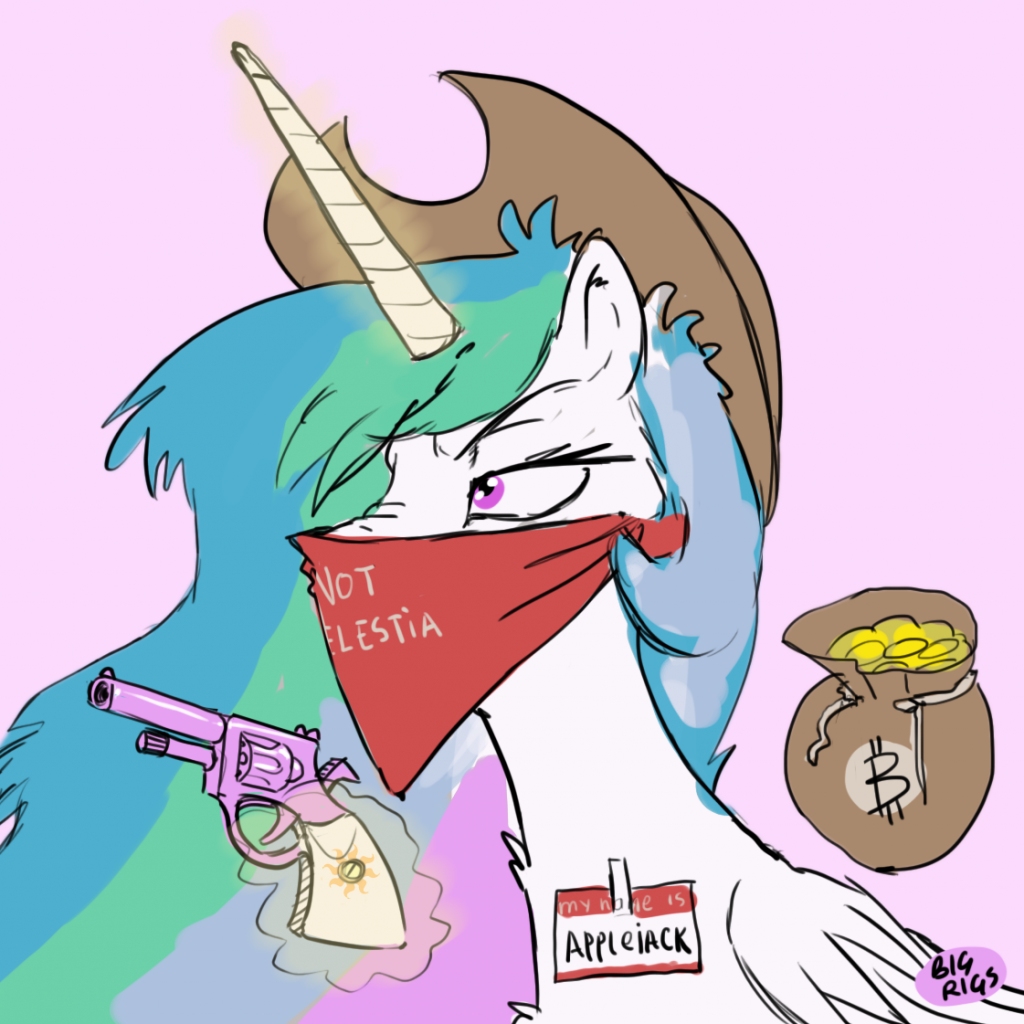 “Ugh,” Celestia groaned, dragging a gold clad hoof across her face. “Now, you listen here, Lil’ Missy, Ah’m taking all the money, and don’t try to stop me!” she clarified, scowling over the fabric masking her snout.