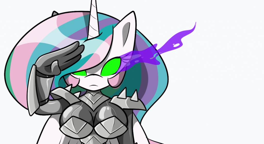 Celestia nodded, saluted him, and stepped forward, her glowing green eyes meeting Twilight's own, widening ones. Her magic took hold of the armor.