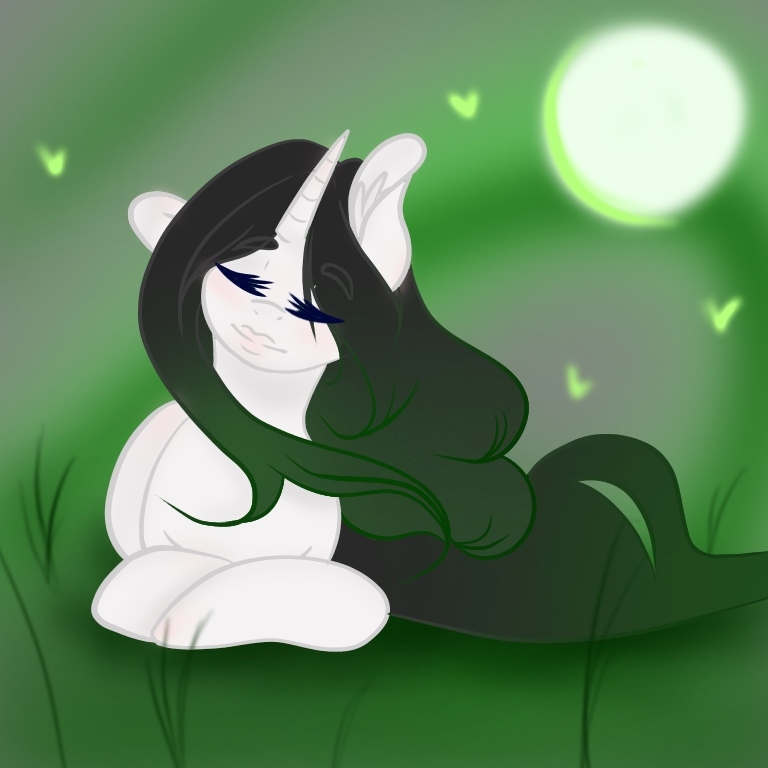 Tears fell as she was in her home at this point laying in the grass looking down while her mane moved to her face. A single firefly flow in front of her landed on top of her snout. She didn't shoo it away, just let it stay there while it stood right back at her.