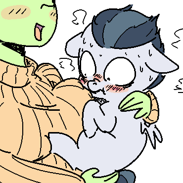 With all the reckless abandon of a sex-crazed youth, Rumble began pounding away. There was no skill or grace, only a colt giving everything he had. He huffed and grunted, as he pistoned himself into her. Though he couldn’t see it, Anon moved her hands to her breasts. Kneading and twisting her nipples, she moaned whorishly, while the small pegasus slaked his thirst.