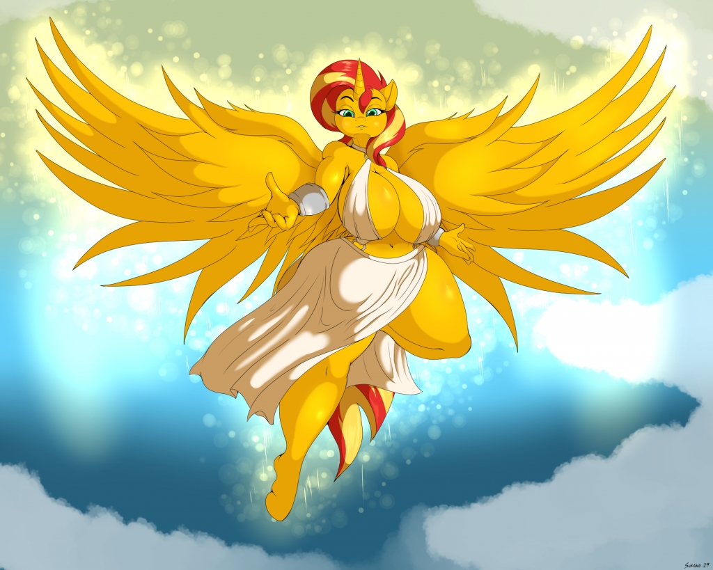 When the light slowly faded away and Inferno could see again, his eyes caught sight of Sunset, completely changed into an entirely different outfit. Not only that, but it appeared that she had transformed her appearance a little. Her raggy clothes turned into this angelic white dress. Her breasts were poking out of her dress and appeared to have grown a little. Her hips got wider and her thighs became a little thicker. The long loincloth covered her front area and part of her impressive ass. And for the icing on the cake, he noticed that she wasn't a unicorn… she was an alicorn.