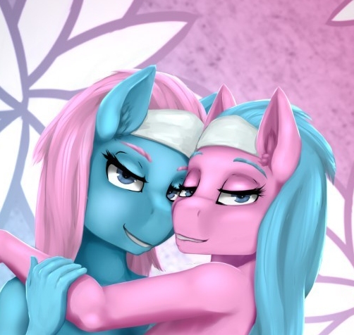You wrapped your arms around both mares, pulling them in, feeling their breasts mash up against your arms. You shuddered in bliss, then felt the twins peck your cheeks. Then they each leaned in to give you a nice kiss on the lips. You kissed them back each and grabbed them by their big, fleshy mounds. One of them even slipped you their tongue as you kissed while the other stroked your meaty dick.