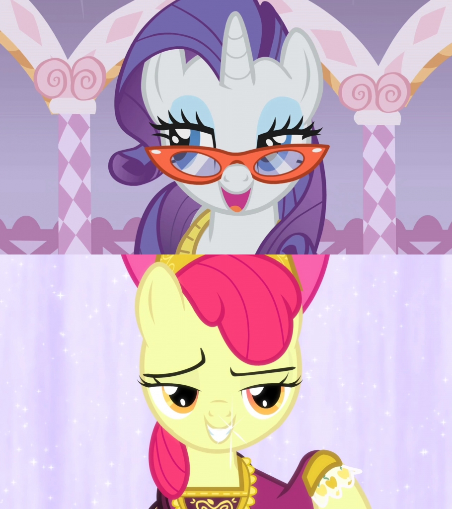 So, as two minds turned the truth round and round to try and get it to fit on their respective pages, Apple Bloom stopped between stuffing her face and apologizing for the crumbs on the floor to inspect Rarity’s face.