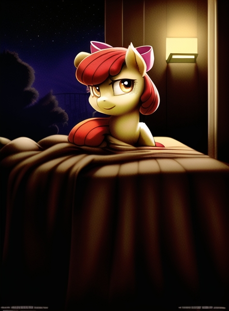 “ApPlE bLoOm?” a voice called from under the bed, shrill like hooves on a chalkboard but somehow thick like dripping honey. The filly fumbled a weak smile and rolled to peak over the ledge of the bed.