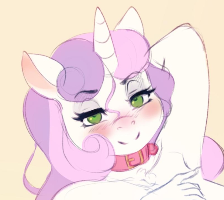 After an hour of laying in bed, Sweetie Belle gave in to her desires. With the covers going up to her neck, the unicorn laid on her back while her legs spread as wide as she could. A hand had gone to her breast, imagining that it was Spike who was squeezing it while her other went for her folds. It surprised her to find how wet she was as her juices were already dripping down towards her ponut, lubricating herself so that two dainty digits could easily slide in. There she had laid for what seemed like hours, playing with her body as she imagined that her hands were really Spike’s. Imagining that his chest was pressed against her back as he stoked the fire burning deep within her being. She imagined feeling his hot breath against her neck as ‘his’ fingers pinched at her nipple, forcing the mare to bite down on her lower lip to prevent her from crying out. All the while she listened for the sound of her doorknob being turned, ready to turn over on her side to pretend to be asleep. But, no matter what she did, her climax seemed so far away. Sweat was beginning to form on her body, rolling down the valley of her breasts as her room began to feel like a boiler. Her mane became matted as well as her fur, yet still she could not cum! It was enough to make her want to cry out in frustration kept in check by her own fear of discovery.