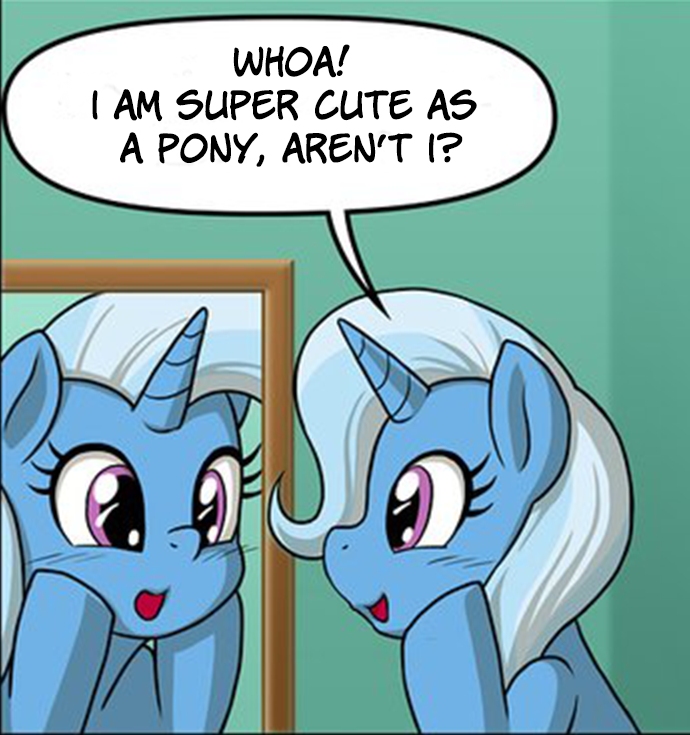 “Hehe, and so cute, too...” The obsessed-looking human chuckled while feeling the soft coat of the mare with her hands. She then turned around and ran out of the room, calling out the skies, “WATCH OUT WORLD, HERE COMES THE GREAT AND MAGICAL TRRRRIXIEEEE!!”