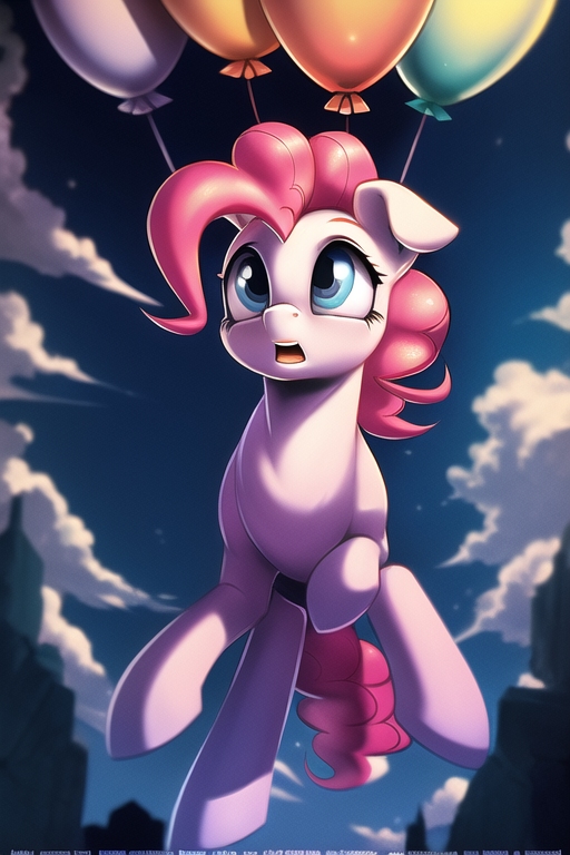 Unlike the bird, Pinkie remained still as the flowing air the bird caught resided dozens of feet below her. The rubber of the balloon made weird pinging sounds like that of a submarine that resonated deeply within the taught surface. Pinkie had no fear of a leak, though a slow one would lower her elevation, for all her thorough testing—bouncing, running into, and leaping off of Sugar Cube Corner onto—the balloon had proved that, aside from being extremely bouncy, it was durable. It couldn’t burst like a typical, ordinary balloon, exploding suddenly, the material recoiling into a tiny, shriveled worm; the mega balloon, or meballoon as Pinkie called it to cause herself fits of giggles, would release air slowly, the strong rubber collapsing inward at a much slower rate. Slow enough, hopefully, to bring the pilot safely to the ground albeit at a more rapid pace should a tear appear.