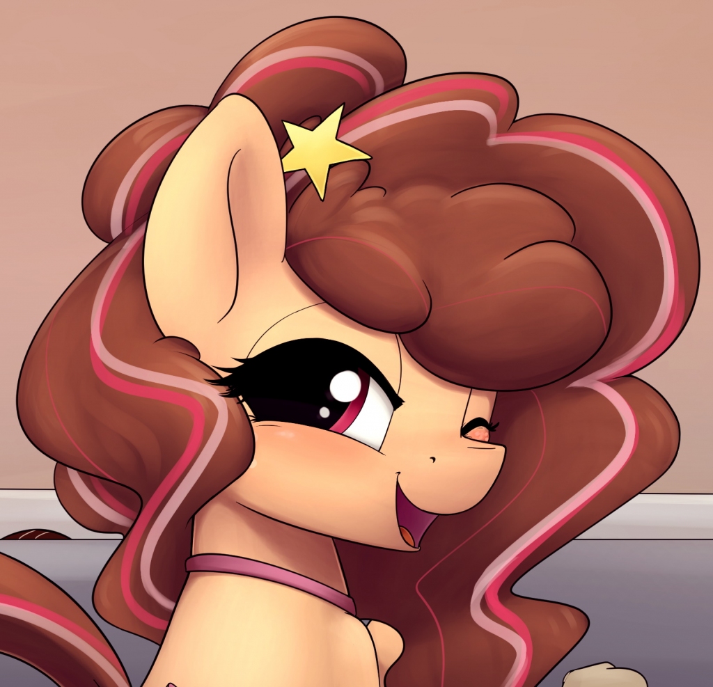 However, all of this left Wind with a very nice view of the baker’s slightly overweight rear, with the creamy coat of the rest of her getting smattered in a powdery white that was mostly just natural colouration, and a cutie mark of a half-eaten cookie stretched out across both soft and plump cheeks which wobbled and jiggled ever-so-slightly as their owner shifted around a bit. Even with the rich chocolate tail with a stripe of rose and white that curled in on itself fell down to cover the delicious mare-parts below, the indigo pegasus could hardly take her eyes away from that lovely sight, and her legs subconsciously took her closer as a flaming blush lit up her face and she bit her lip in a desperate attempt to conceal her lustful urges.
