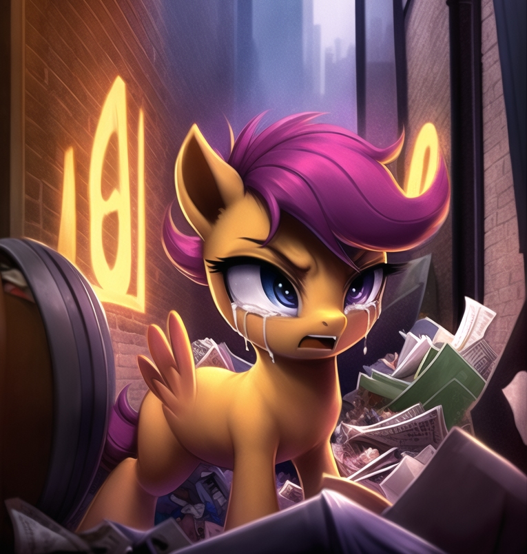 Rooting through garbage didn’t bother Scootaloo anymore. She had learned that there were plenty of good things to eat that were thrown away because they had turned a little stale. She understood that a business like Sugar Cube Corner couldn’t sell products that were old or hard, but just throwing them out when there were ponies who would eat them bothered her. She never wanted to go to the orphanage, but if the Cakes gave the leftover food to such establishments it would cheer up the nearly soul-dead foals that dwelled within them.