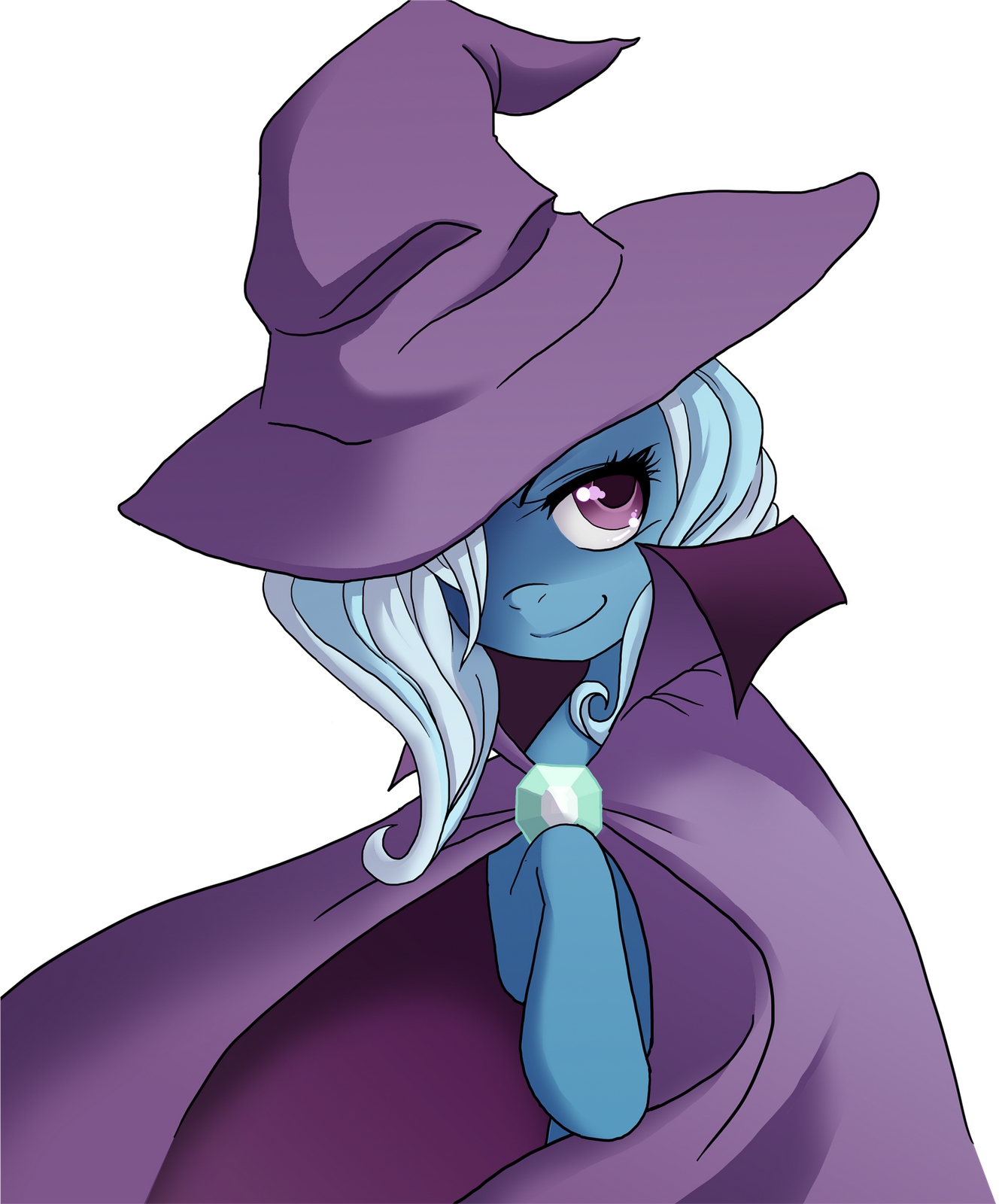 Trixie smiled back, and took a step back from Twilight’s hold. “Right, well then…” She pointed down to the broach on her cape. “This thing is stuck. Trixie sealed it with her magic, to ensure that it wouldn’t come undone, but she may have overshot the spell, and now… well, just give it a try.”