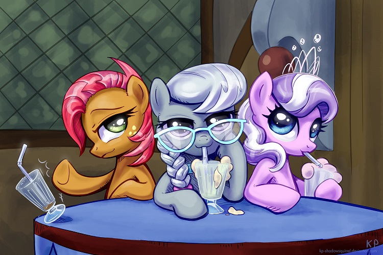 With a menacing glare and some quick hoof action, she drove off the crusaders. Quickly, Diamond Tiara and Silver Spoon joined her at the table, each claiming a milkshake as their own.