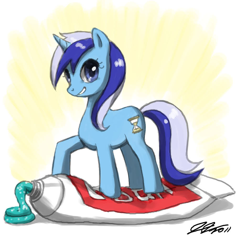 Eager not to waste anything, and to prolong the pleasure Luna must be feeling, Colgate jumped up again and latched back onto her quivering quim. She felt hot gushes of Luna’s cum fill her mouth with a sharp, sweet taste that left her wanting more. She eagerly swallowed the strange fluid, feeling it tingle its way down towards her stomach. At the same time, she levitated over one of her toothbrushes and quickly began to rub its head over her own slit. Her time with Trixie had taught her many things about using whatever was at hoof and she had mentally berated herself for not realising the sexual potential of her most cherished tools earlier.