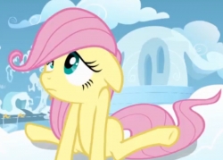 Feeling defeated, Fluttershy strolled away from the others, her head held low. Luckily, she had found a place where she could be alone, it was behind the rainbow waterfalls and not many ponies knew about it. Fluttershy had come here many times before to practice stretching her wings in private and sometimes just to think about things. Today was not a day where she felt like practicing. The yellow pegasus sat her rump down on the soft clouds and watched the rainbow pour down from overhead. It splashed quietly into a pool a short distance away from her. Fluttershy closed her big blue eyes and just listened to the sound. It was relaxing. She imagined what it would be like to be a great flyer like so many of her peers. She pictured herself soaring high above the clouds. She wasn’t interested so much in acrobatic stunts and feats, but she let her mind simulate the feeling of loop-de-looping around a big, puffy Cumulus. The pony sighed at the seeming impossibility of her dream. While Fluttershy was lost in her own imagination, she failed to notice that she was no longer alone.