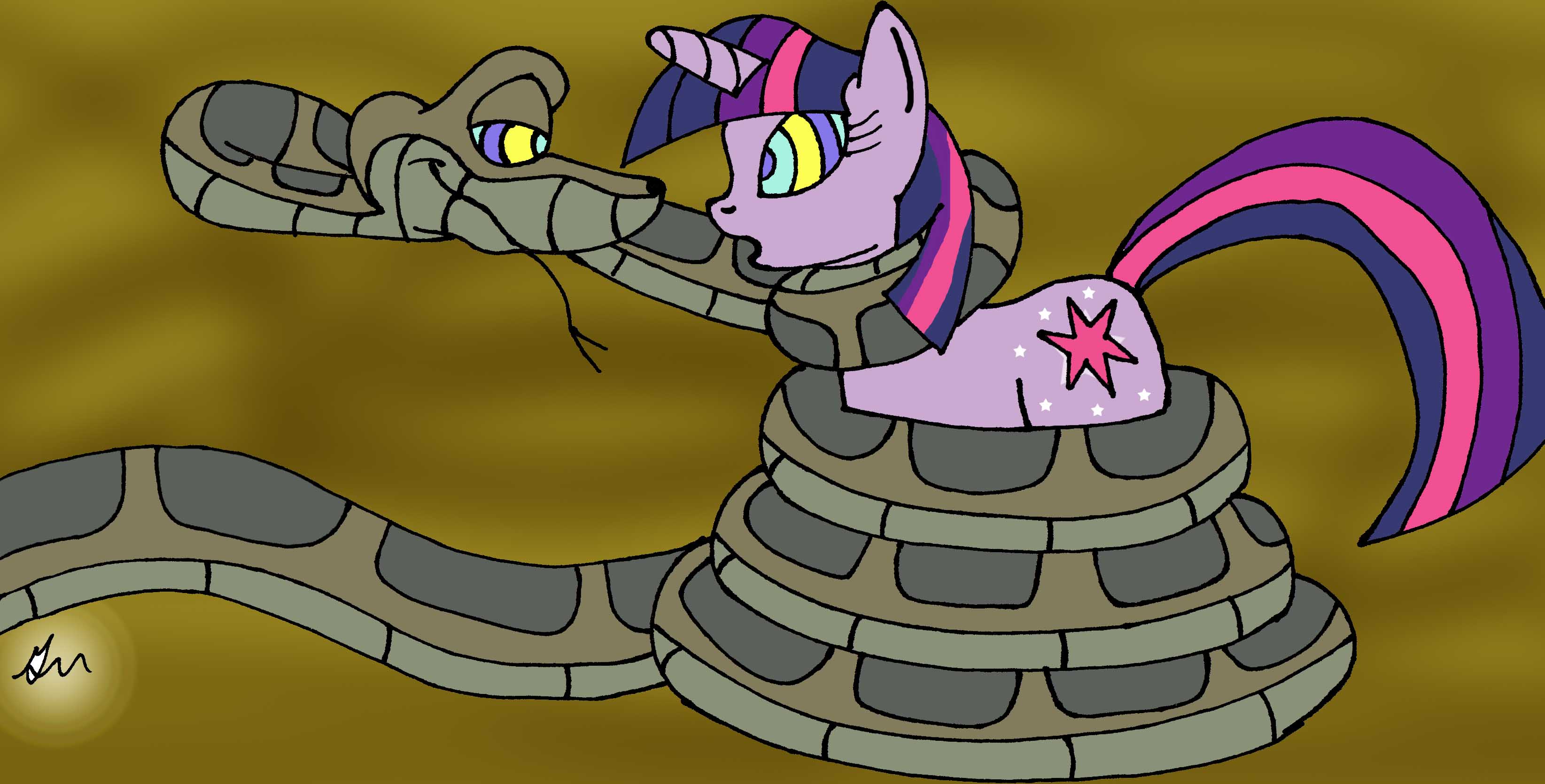 She smiled and tasted some of the saliva from the snake’s throat. Twilight decided to enjoy this incredible experience to the fullest, and slid a slippery hoof down past her stomach.