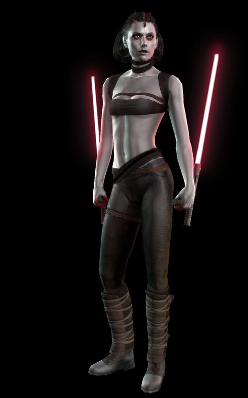 The Sith threw her arms forward to reveal bare grey skin and two tonfa sabers. Seeing them made Starkiller recall where he'd sensed that presence before.