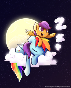 Rainbow was woken again by a stirring Scootaloo trying to escape the captivating cyan wing that doubled as her blanket as well as her prison. A smile crept over Dash’s face as she gently folded it back to her side.
