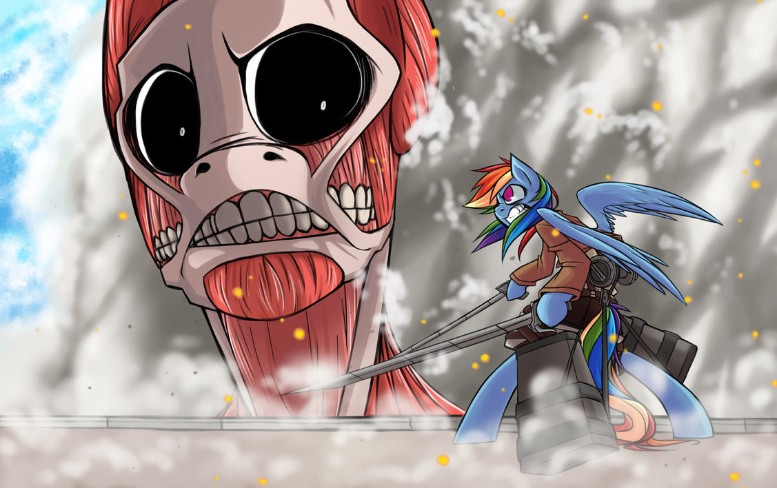 It would be less than a minute before the lumbering behemoth was within striking distance of the Wall. It was up to Reinbow Dash and the Guard Corps to make sure it didn't get that far, though so far they hadn't been able to stop more than one Titan Pony before it reached the Wall. That had been one of her many personal kills.
