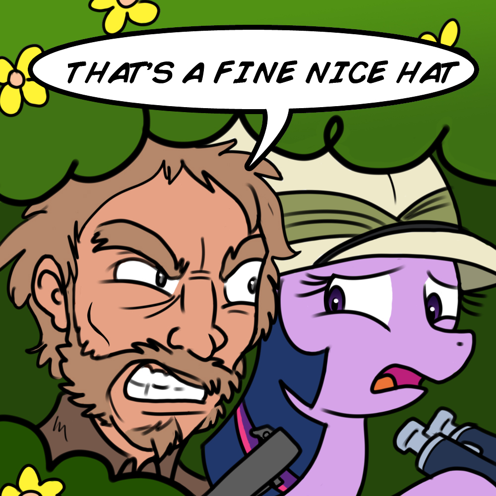 Twilight looked at the ancient box; it was heavy and unusually cold to the hoof when she touched it. The most peculiar thing about it was in the top left corner, there was a picture of a hat- it matched perfectly the one she discovered when she first moved into the Ponyville library, next to some binoculars and other knick-knacks she found in a closet. The creature wearing the hat, though, was like no pony she’d ever seen before, the snout was all wrong and the eyes too small. She shuddered nervously and looked around again.