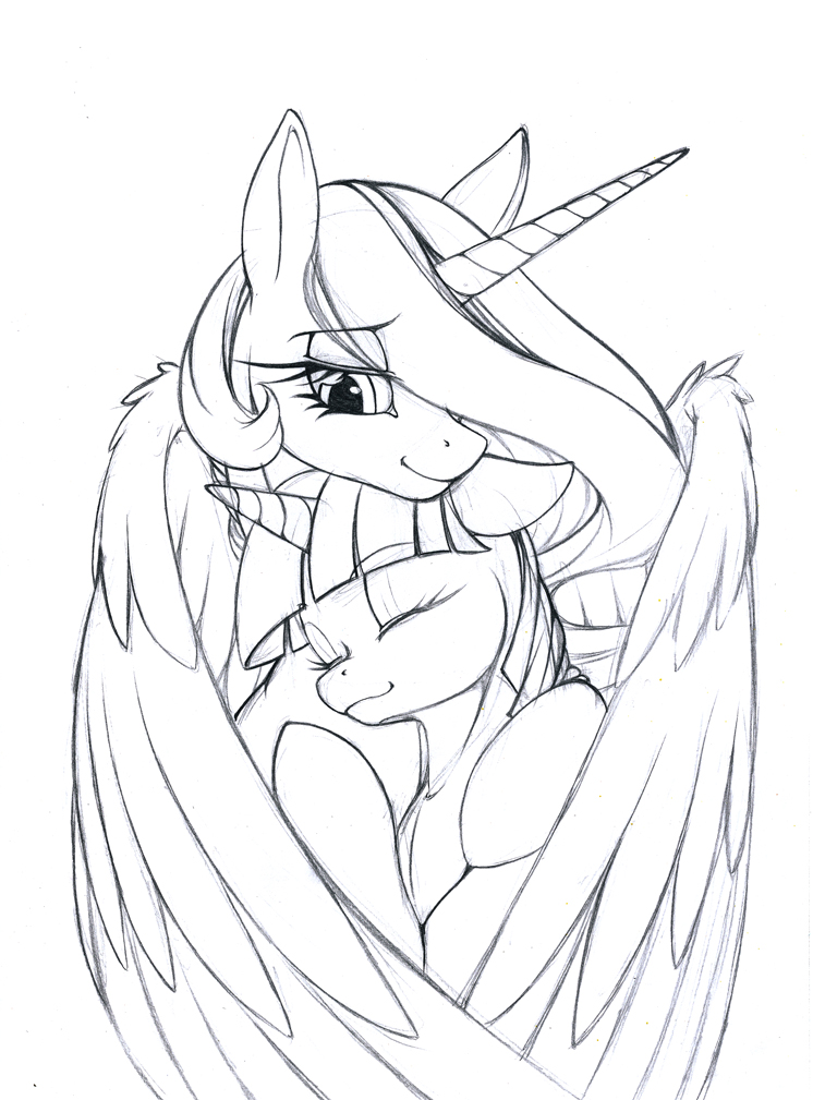 Celestia stood, a sad smile on her face. She walked over, lying down next to Twilight, pulling her into a hug. The embrace seemed to melt Twilight’s last strands of composure, and the alicorn began sniveling and snobbing in earnest. Celestia gently kissed Twilight on the crown of her head, slowly running a hoof through her hair, just letting her cry it out.