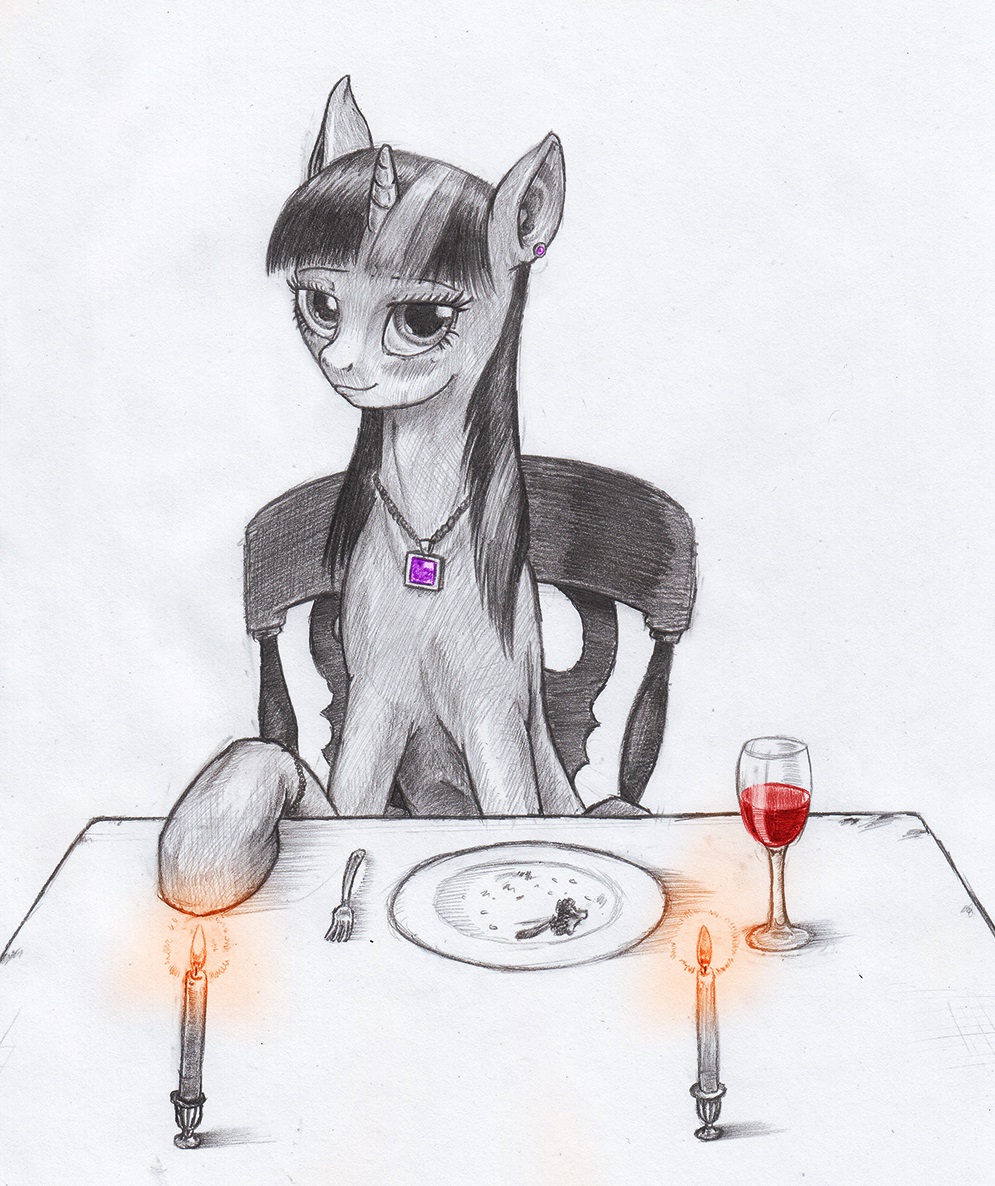 Twilight’s mind froze for a second and she spaced out. “Ahhhh,” was all she could say. Of the possible things Night Song could have asked her, asking her out to dinner was probably in the bottom three, right before deposing Celestia and cheating on a test. Despite having been living in Ponyville for several years now, she couldn’t actually lay claim to ever having been taken out to dinner by a stallion. It had seemed a detriment to useful study time, but here was the object of her scientific interest offering to do just that.