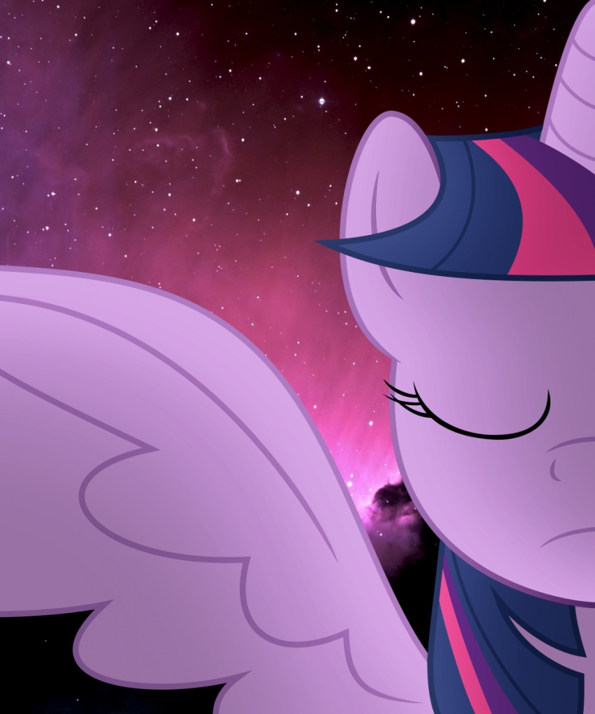 Princess Twilight's legs dangled loose beside her in the weightless void through which her body, gaze, and thoughts all drifted in solidarity. Within the endless abyss of black nothing, Celestia's Pride hung by imperceptible strings in the distance, its stream of photons draped across her and bouncing off her coat in violet hues. The world spun beneath her hooves, a colossal marble of bright greens, blues, and whites. Twilight's eyes turned to her only companion in the void. Her jaw actuated and words slid from her mouth, floating out from between her lips and painting the distant galaxies with shades of contemplation.