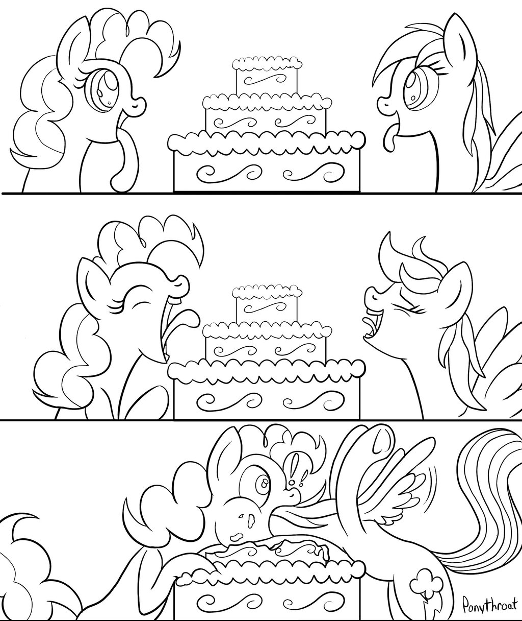 Whatever Dash was going to say was cut off when, upon reaching the bottom of her chin, Pinkie opened her mouth impossibly wide and engulfed Rainbow’s entire head. She began slathering her tongue all across Dash’s face, ears, and mane. Each part of the pegasus’ body had a different mix of batter, frosting, custard, and icing covering it, not to mention a different texture against her tongue, resulting in a brand new taste sensation everywhere she tried. Pinkie found her prismatic mane especially enticing. Not only had the long hairs captured tons of sugary sweet slop, but each color seemed to have a slightly different flavor of its own as well.