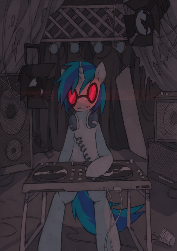 It wasn’t however, everything Vinyl had in store. She downed the energy drink and lit another cigarette, levitating a theremin to her. She put her hoof in its magnetic field, creating an uncanny noise, something between buzzing of a damaged electronic device and cries of a mare who lost her family in some kind of a terrible accident. Vinyl smirked, deciding that it was time for more samples from her dictaphone. Low-quality recordings of a crowd cheering during one of her shows, her own breath and Octavia’s moans during orgasm were all added to the mix, almost unrecognizable after Vinyl merged them together, changing their pitch and distorting them, creating a wicked soundscape consisting of various emotions. Laughter, pity, sadness, arousal, joy, all gathered together in one place.