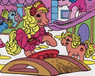 As to the other mare in Ponyville, Applejack realized there were many diffrences between this and previous generations of Ponyvillians. The old red mare noticed that there were small heart shapes in the eyes of each pony present, an odd physical trait that the Ponyvillians must have developed in the years since she left, AJ reasoned. As the two mares led her into a small restaurant, the Cotton Candy Cafe, the two ponies began to introduce her to all of their friends there.