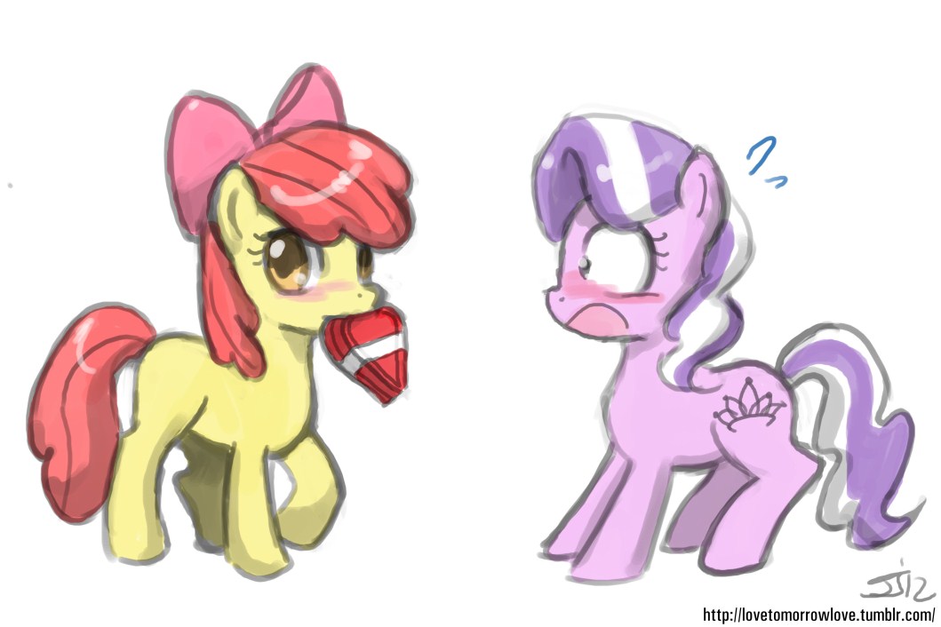 “Oh, ah have one we can play,” Apple Bloom whispered as she walked up to Diamond Tiara. “Ah like ta call it ‘Assault on Belly Mountain’.”
